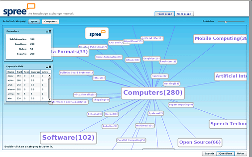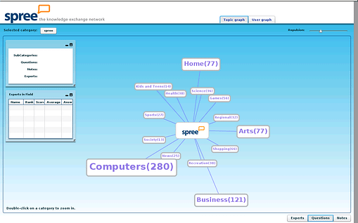 De este modo, se anima a los miembros de Spree a que se unan formando comunidades en función de los distintos tópicos de sus preguntas enriqueciendo con ello al conjunto mismo de la base de conocimiento de Spree buscando en esencia generar una base de conocimiento en torno a aquellos temas cuya información no se encuentra en internet, vinculando cada pregunta a un experto con conocimiento en el área.