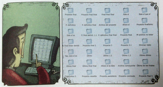 Aunque pueda parecer algo de carpintería y de importancia menor, lo muestro porque considero que no sólo ha sido parte de mi aprendizaje, sino que puede ser de utilidad para alguien que, como yo, emprenda una tarea similar de escritura en varios tiempos.Pese a que, como tutora, me he encontrado en dos ocasiones con personas que gustan de escribir a mano y luego transcribir lo que redactan, con mucha más frecuencia me encuentro con personas que utilizan computadoras o tabletas como su principal instrumento de escritura de documentos. Sin embargo, cuando comenzamos a escribir algo, hablo desde mi experiencia, y aunque cada quien tiene su propia manera de llamar, atraer y retener la inspiración, lo cierto es que no siempre ésta nos ocurre cuando tenemos a mano las herramientas para escribir., o nos ocurre que modificamos el texto que vamos escribiendo una y otra vez, pero no sabemos exactamente en cual documento digital está recogida la última versión de lo que hemos escrito. La siguiente caricatura de Albert Montt(http://dosisdiarias.com) ilustra lo que conocemos bien sobre el típico manejo de versiones por parte de quienes escribimos pero no sabemos de organizarnos.Fuente: Montt (2012)Finalmente, a veces sucede que trabajamos desde varios lugares sobre el texto que estamos escribiendo y nos lo enviamos por correo o grabamos en una unidad extraíble las innumerables versiones del documento y sus respaldos. Yo no he estado exenta de padecer estos problemas y por ello, además de querer hacer este libro, he querido aprovechar herramientas de escritura de texto y de control de versiones más propias del desarrollo y documentación de software, puesto que, realmente, las considero con un papel determinante en la ardua tarea de enfocar las sesiones de escritura y de aliviar la tarea de seguimiento de los cambios realizados.